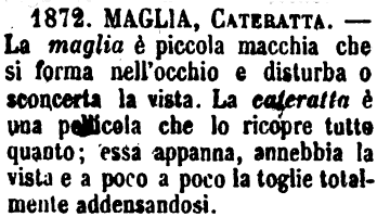 Maglia, Cateratta - La maglia è piccola macchia che si forma nell'occhio e disturba o sconcerta la vista. La cateratta è una pellicola che lo ricopre tutto quanto; essa appanna, annebbia la vista e a poco a poco la toglie totalmente addensandosi. [immagine]